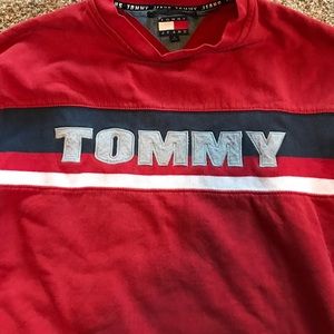 Red Tommy crewneck with Tommy written in blue white and grey.