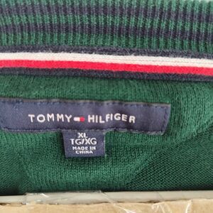 The Vintage Tommy Hilfiger v-neck pullover sweater in Men's XL is a stylish and classic addition to any man's wardrobe. Made from a green knit fabric, this sweater features a solid pattern with a V-neckline, long sleeves, and a regular fit. The Tommy Hilfiger brand adds a touch of nostalgia and quality to this timeless piece, making it both comfortable and fashionable for everyday wear. Easy to care for with its machine washable design, this sweater is a versatile and must-have item for any man looking for a vintage touch in their clothing choices.