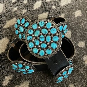 This is a Vintage and gorgeous Tommy Moore Concho Belt with the main belt buckle consisting of 18 Kingman Turquoise signed Tommy Moore, Sterling. There are 10 conchos in total including the buckle, the remaining 9 sterling conchos each have 9 Kingman Turquoise Stones.