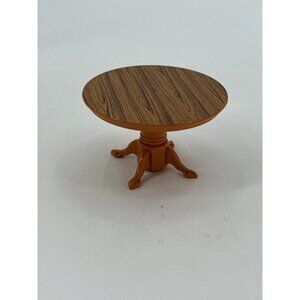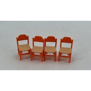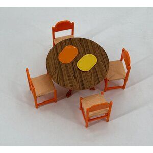 This vintage Tomy dollhouse kitchen set includes a round table and four chairs,the stove island and the sink island crafted from durable plastic. The set showcases a retro orange, yellow and brown color scheme, perfect for enhancing miniature play scenes.