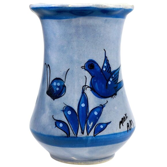 Vintage Tonalá Pottery Vase – Signed Blue Bird & Butterfly – 5.5" Mexico Art