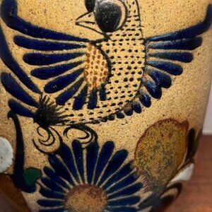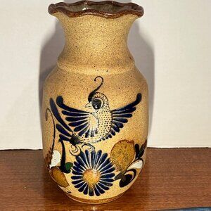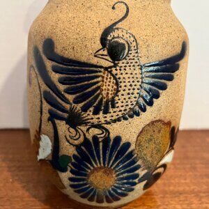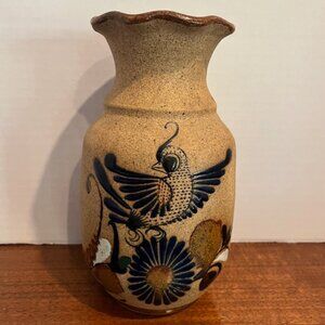 Vintage Tonala Mexican Folk Art Pottery 8" Vase with Hand Painted Bird