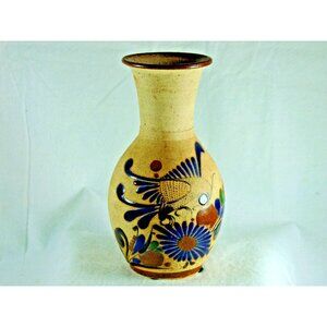 Vintage Tonala Mexican Sandstone Stoneware Pottery Vase Signed Floral Bird 8.5”