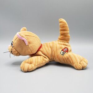 Vintage plush kitten from the Tonka Pound Pur-r-ries franchise. This orange tabby cat stuffed animal has brown stripes and a plastic pink nose. It measures approximately 7" long and has the Pound Purrries badge on its rump.