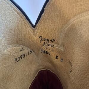 Step up your Western style with these vintage Tony Lama cowboy boots! These high-quality leather boots feature a classic brown leather upper with intricate stitching, a pointed toe, and a stacked heel for that authentic cowboy look.