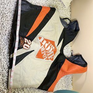 This amazing leather vests celebrates NASCAR’s Tony Stewart with this Home Depot sponsored black and orange leather vest. One tiny mark on the front about the Home Depot logo. Fully lined.