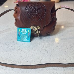 Vintage Tooled Genuine Leather Festival Saddle Bag Mini Purse Toggle Closure