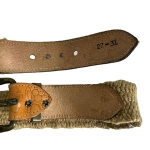 Vintage Tooled Leather Elastic Waist Belt. Super unique vintage boho belt. Tooled/stamped leather with flowerr, mushrooms, butterflies and some paint/dye details. Stretchy woven elastic belt. No brand.