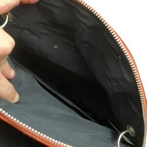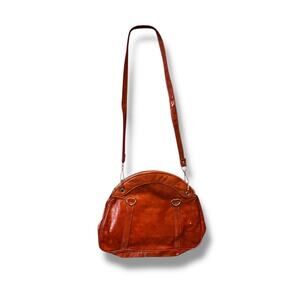 One-of-a-kind vintage hand-tooled leather handbag with a bold abstract art scene in warm orange-brown tones. Features colorful embossed details, tall dome silhouette, and a long adjustable strap. Interior is black fabric-lined with one pocket. Zip closure with YKK hardware. Shows light vintage wear including small peel on back and some creasing, but overall great patina and structure. Perfect statement piece for collectors and retro style lovers.