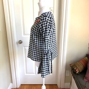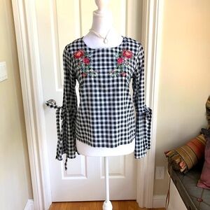 Beautiful vintage top, pastel floral embroidery on black and white checks, long Flowy bell sleeves with ties, button back closure
