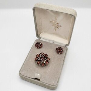 Set of vintage amber orange rhinestone brooch and earrings in gold tone setting. Rhinestones are arranged in a circular wreath pattern. Brooch rhinestones are 4 and 6 mm in diameter, and earrings are 3 and 4 mm. Brooch measures 23 mm diameter, earrings 13 mm. Earrings 3 grams, brooch 7 grams. In original box. Faint makers mark on back of brooch, maybe FE?