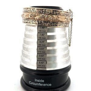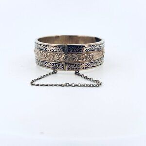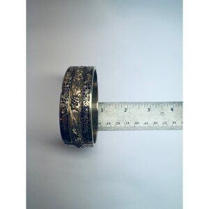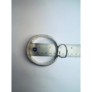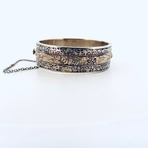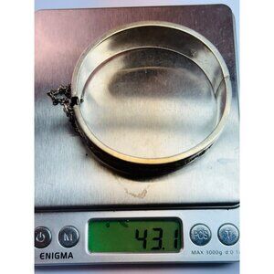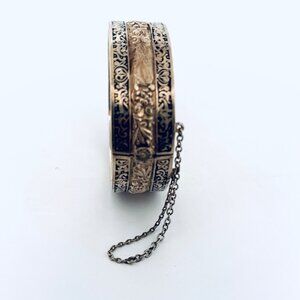 Add a touch of vintage elegance to your collection with this exquisite Topazio Mexico sterling silver 925 cuff bracelet. This stunning piece features a bold black enamel inlay and a wide, hinged design that sits beautifully on a 7" wrist. Weighing 43.1 grams, this bracelet is a statement of luxury and craftsmanship, complete with a secure safety chain for added peace of mind.