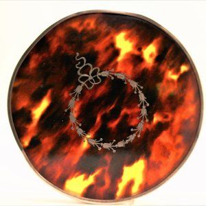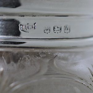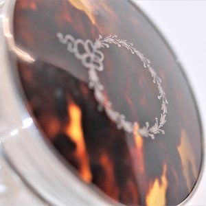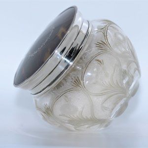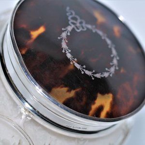Vintage British hallmarked crystal, sterling silver, & tortoise shell vanity jar etched in silver on the lid.