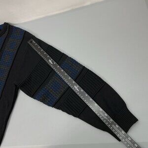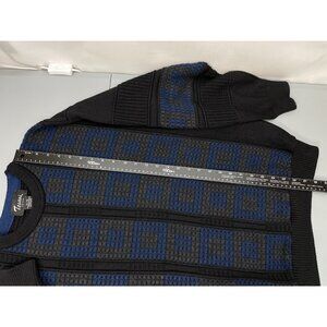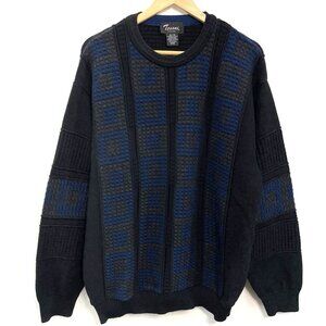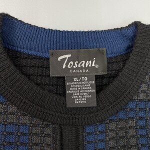 Vintage Tosani Crew Neck Sweater Chunky Waffle Knit Geometric Wool Blend Black Blue Mens XL Made in Canada