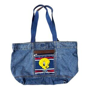 Vintage Tote Bag Denim Tweety Bird 1990s Y2K Retro Shoulder Purse Grocery Blue