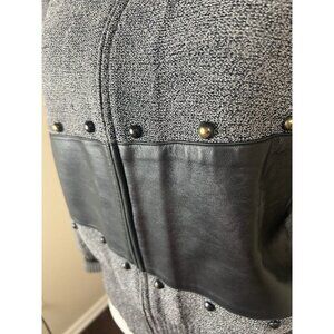 Gorgeous vintage Santana knit sweater from Toula, made in the USA. Black and white marled in color, with front asymmetrical leather accents across the lower front. Studs embellish the front, lower sleeves at cuffs and around the neck front and back. Full front zip and low mock neck. Thin shoulder pads. Just a striking, sophisticated sweater.