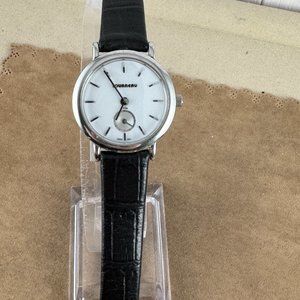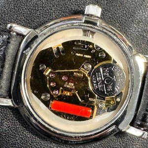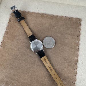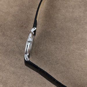 Vintage 1990's Vintage Tourneau Watch 1064 Swiss made Perfect Sapphire Crystal All Stainless Steel Case Quartz Swiss 6 Jewel V8 Movement Sub Dial Second Hand with Silver Hands and Raised Accents Super Thin 5.2 Case. Black Leather Strap 8.5 inches in length with 1 inch Case Diameter Swiss Movement. Tourneau is a member of the Swiss Luxury Watch Maker Bucherer AG. Tourneau Swiss Designed Watch Swiss Movement would be a great watch keeps time Stainless Steel Back,