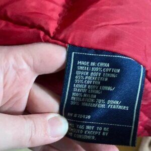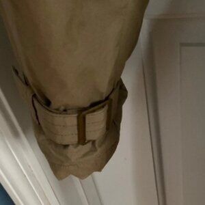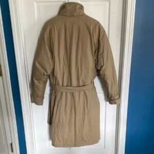 This classic tan trench coat features a knee-length design and a wide, folded collar for a timeless look. Crafted from lightweight, water-resistant fabric, it offers both style and practicality. The matching fabric belt cinches the waist, adding a touch of elegance to this versatile piece. Belt buckle matches cuff buckles. Zips and buttons shut. Outer layer 100% cotton. Insulation 70% down feathers and 30% waterfowl feathers. They don’t make them like this anymore!