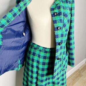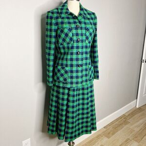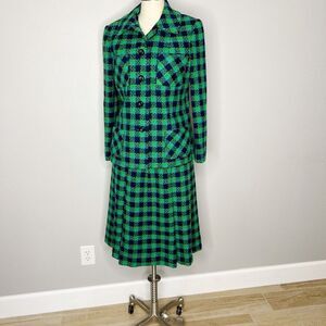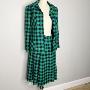 Vintage Towncliffe Tweed Plaid Skirt Blazer Jacket Suit Set Green Blue