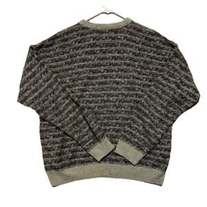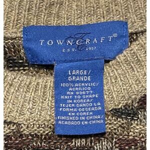 This Vintage Towncraft Sweater in size L is a cozy and stylish addition to any man's wardrobe. Made in Korea in the 90s, this sweater features a fuzzy textured design in earth tones, perfect for casual or business occasions during the winter, fall, and spring seasons. The long sleeve pullover style offers a regular fit, ideal for walking or golfing activities. With a classic striped pattern and acrylic material, this sweater is a versatile piece that can be machine washed for easy care.