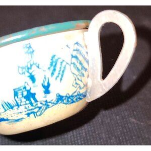 Vintage Toy Blue Willow China Tea Set Antique Metal Miniature