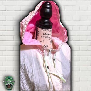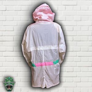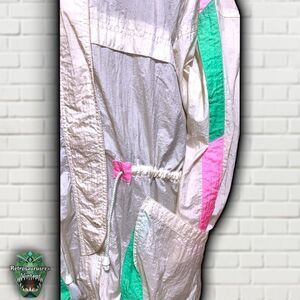 Retrosaurusrex Vintage; vtg; puffer; raincoat; ski; California winter; bright; color blocked; gift; present; Xmas; Christmas; oversize; baggy; track jacket; fluorescent; streetwear; unisex; pop art; indie; y2k style; Vintage 1980’s Pastel Pink Green Oversized Kidcore Nylon Twee Windbreaker, Large, XL