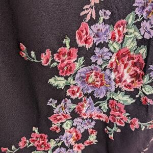 100% Rayon, vintage slip dress from Tracy Reese, dark brown with floral pattern, beautiful intricate beading along the flowers. The scoop neckline with bust stitching is SO flattering, and there's the perfect amount of ruffle at the hem. Knee length, lined, pullover.