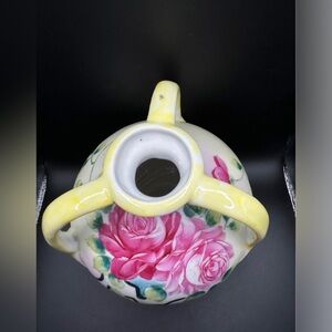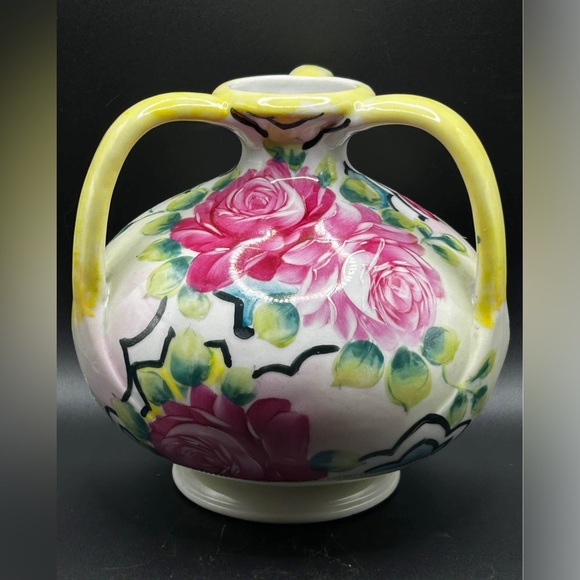 Vintage Trademarked Hand Painted Floral Ceramic Three Handled Vase, Cottagecore