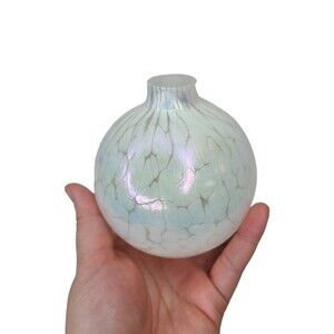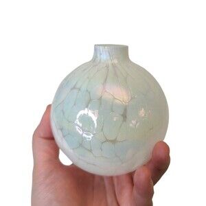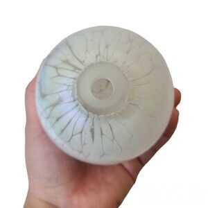 Vintage Traditions Hand Blown Iridescent Glass Oil Lamp. Beautiful oil lamp with iridescent white design. Comes with cotton wick and funnel. Never used in original box. Cones with instructions.