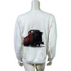 Classic 1990s unbranded sweatshirt featuring dual train graphics - a dramatic front-facing locomotive engine on the chest and a red caboose on the back. The black and red screen-printed designs pop beautifully against the white cotton blend fabric, creating a striking railroad-themed piece.