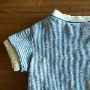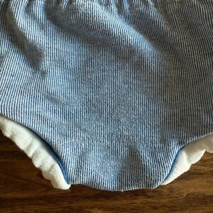 Short sleeve top, double shoulder snap, thin blue vertical stripe with white trim, blue/green/red train applique with matching button detail on chest. Matching bloomers with elastic waistband.