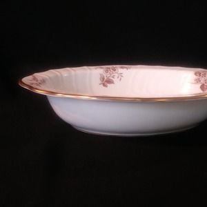 Brown floral transferware with scalloped edge and gold trim.
