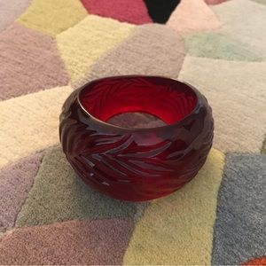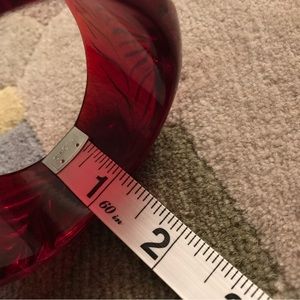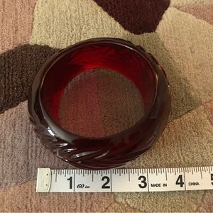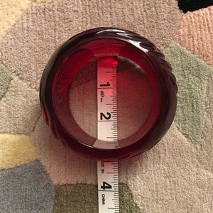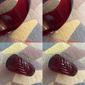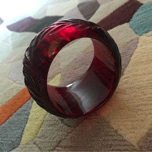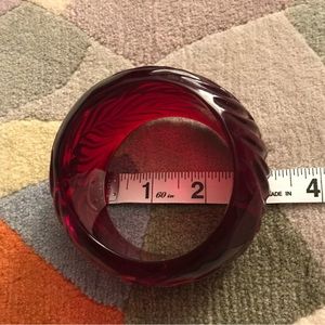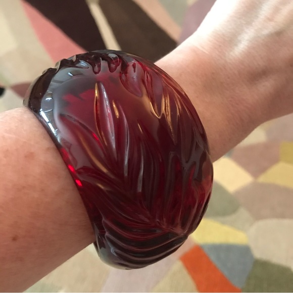 Vintage transparent “cherry juice” wide carved leaf lucite bangle. Unique, chunky domed oversized shape with deep carving of leaves all around. Nice weight. Great vintage condition. Some minor age appropriate wear—minor markings / scuffs inside (see 📷 8 & 12) and two very tiny chips (one inside and the other on the outside see 📷 8), that are basically invisible to the naked eye.