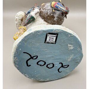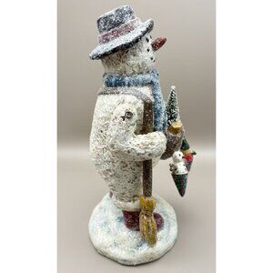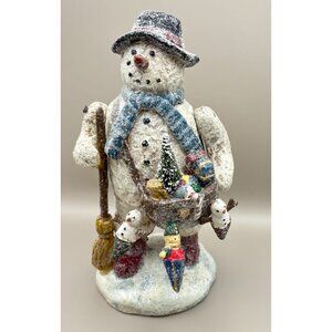 This charming snowman figurine, standing approximately 9 inches tall, features intricate details with holiday accents. The vintage design by CJF is perfect for adding a festive touch to your home decor. Crafted with care, this piece showcases a snowman carrying a broom and a basket of colorful toys.