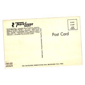 This charming postcard captures the essence of a bygone era at the Travelodge Amarillo West. It features a lively pool scene with guests enjoying a sunny day, while the iconic Travelodge sign towers in the background. A nostalgic piece for any collection or a unique memento of Amarillo's hospitality history.