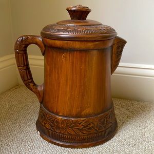 This vintage Treasure Craft cookie jar with lid is shaped like a coffee pot.
