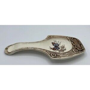 Spoon rest has only minor wear and no chips or cracks. Add a touch of vintage charm to your kitchen with this beautiful Treasure Craft spoon rest. The butterfly pattern and multicolor design make it a unique addition to any collection. Measuring 10 inches in height and 4.25 inches in width, this medium-sized spoon rest is perfect for supporting your favorite spoon.