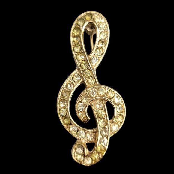 Vintage Treble Clef Brooch Yellow Rhinestones Gold Tone Musical Theme