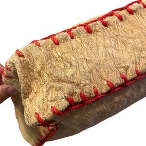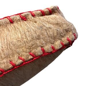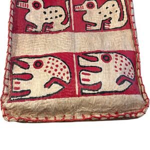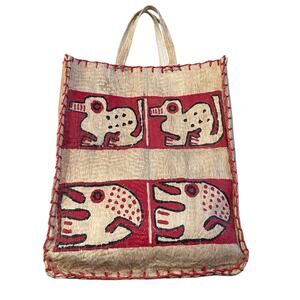 • Vintage tribal tote bag with natural fiber construction and red stitched accents • Features bold folk art animal graphics and a structured silhouette • Perfect for boho styling, folk art lovers, or unique accessory collectors