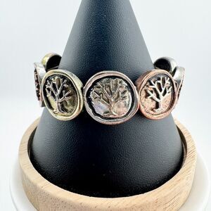 Step back in time with this unique & meaningful vintage bracelet. Featuring a series of mixed metal coins adorned with intricate tree of life motifs, this piece represents growth, renewal, & the interconnectedness of life. This timeless design is sure to add a touch of spiritual elegance to any outfit.