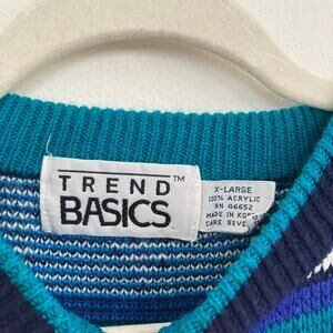 Vintage 80s or 90s Trend Basics funky geometric navy blue and teal crew neck pullover sweater.