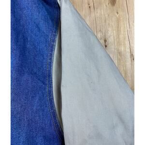 Vintage Tri-Mountain CropLand Genetics Big Stone Co-op jacket in a varsity/bomber style. Features a denim cotton body, quilted lining, and tan nylon sleeves with rib-knit striped cuffs and hem. Embroidered CropLand Genetics logo on chest. Tagged size 2XL.