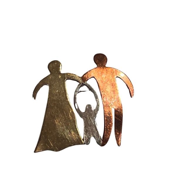 Vintage three tone brooch. This lovely brooch is gold, copper and silver tone. It depicts a Family Group. Including a gold tone mother, silver tone child and copper tone father. An usual and interesting Mother's gift.