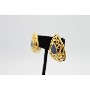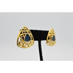 Vintage Triangle Clip Earrings Gold Tone Navy Blue Enamel Geometric NOS 1980s W4