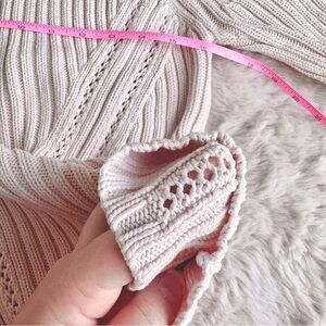 Charming vintage coquette sweater in baby pink with mock neck and crochet knit detailing. Perfect for retro, pastelcore, or feminine layering outfits. Slight yellowing on neck. Good condition.