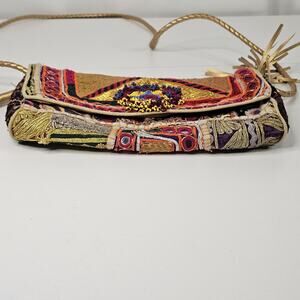 This Vintage Tribal Banjara Indian Handmade Ethnic Women Purse Designer Shoulder Bag is a medium-sized clutch bag featuring intricate embroidered patterns on a multi-color fabric exterior. The bohemian design and Indian theme make it a unique and stylish accessory for women. Made in India with eco-friendly materials, this handcrafted bag measures 10 x 7 inches, making it the perfect size for carrying essentials while showcasing traditional Indian craftsmanship. Ideal for adding a touch of ethnic flair to any outfit, this shoulder bag is perfect for those who appreciate vintage charm and artisanal design.
