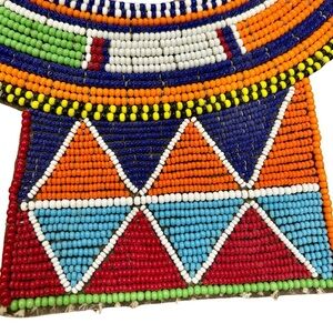Make a bold cultural statement with this stunning vintage tribal beaded necklace. Handcrafted with vibrant glass seed beads in a circular bib design, this piece showcases a mesmerizing mix of geometric patterns and vivid colors including orange, blue, red, green, and white. The necklace features a dramatic front panel with traditional triangular motifs, symbolizing heritage and artistry.