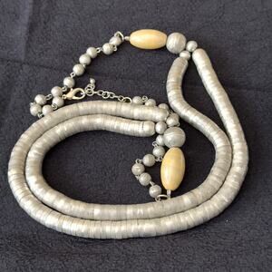 The beads have a warm, brushed patina with visible tooling marks and variations that suggest handmade origins. The necklace is completed with round silver-tone connector beads and a metal beaded chain leading to a lobster claw clasp with extender chain for adjustable fit.