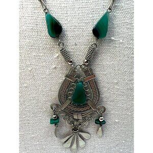 This exquisite vintage necklace carries the essence of tribal artistry with its intricate silver craftsmanship and vibrant green stone inlays. The dangling charms add a touch of whimsy and movement, making it a unique accessory for those who cherish traditional and eclectic styles.
