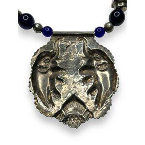 Bold and beautifully detailed vintage statement necklace featuring an oversized embossed pendant with mirrored elephant motifs. Finished with geometric silver-tone beads and deep blue accents, this piece brings striking tribal and bohemian character.